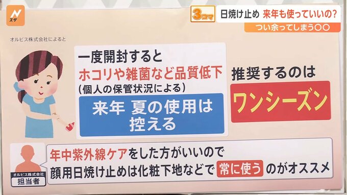 オルビス株式会社によると、個人の保管状況によりますが、一度開封するとホコリや雑菌などで品質が低下するため、来年の夏の使用は控えた方がいいということです。推奨するのはワンシーズンだそうです。