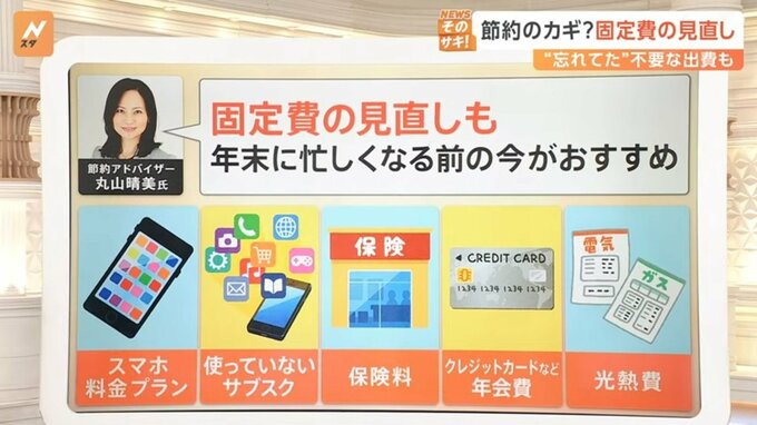 節約アドバイザーの丸山さんによると、「固定費の見直しも年末に忙しくなる前の今がおすすめ」だといいます。スマホ料金プラン、使っていないサブスク、保険料、クレジットカードなどの年会費、光熱費など細かくチェックしていきたいですね。