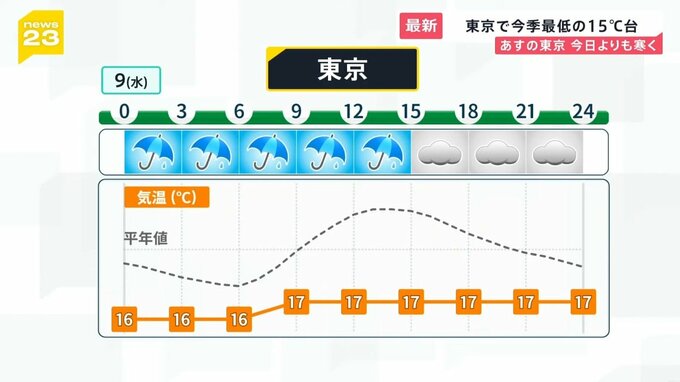 東京では雨が9日の昼すぎまで降り続き、日中は17℃くらいと11月中旬並みの気温になる予想です。