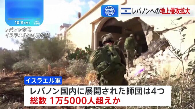 イスラエル軍は、地上侵攻を続けるレバノンで南西部に新たに1個師団を追加投入したと発表しました。レバノンに投入された兵士の総数は1万5000人を超えたとみられています。イスラエル軍は8日、レバノンを拠点とす…