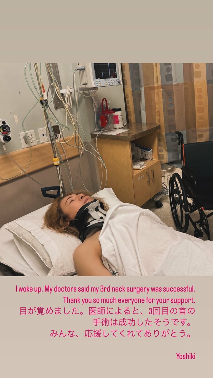写真と共にコメントも掲載し、YOSHIKIさんは「 目が覚めました。」と書き出し、「医師によると、3回目の首の 手術は成功したそうです。」と報告。