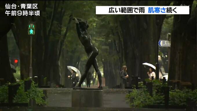 9日の宮城県内は広い範囲で雨が降っています。気温が朝からあまり上がっておらず、肌寒さが続いています。仙台市中心部では午前、傘をさし、上着を着て歩く人の姿が見られました。9日の県内は、湿った東風や気圧の…