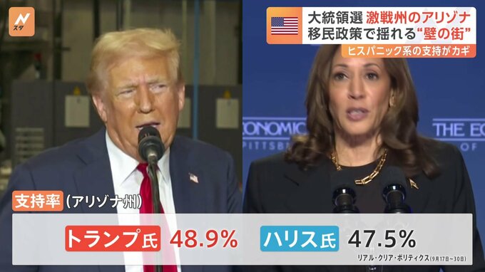 アメリカ大統領選挙のシリーズ「激戦州の現場から」です。最大の争点でもある移民政策をめぐって、国境沿いの激戦州では、民主党から共和党支持に乗り換える動きが広がっています。記者「メキシコとの国境に面する…