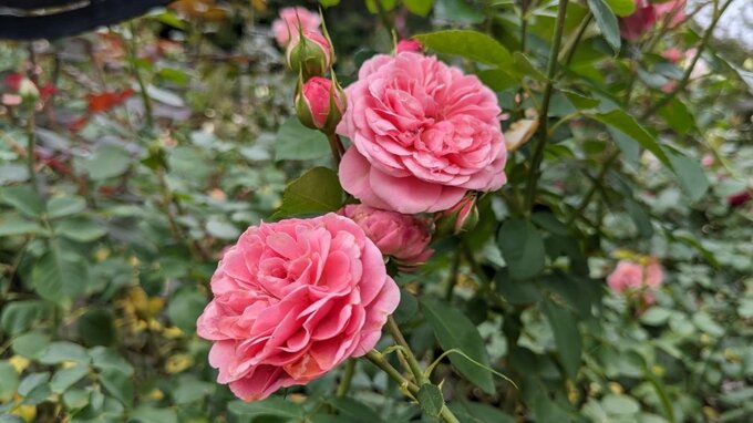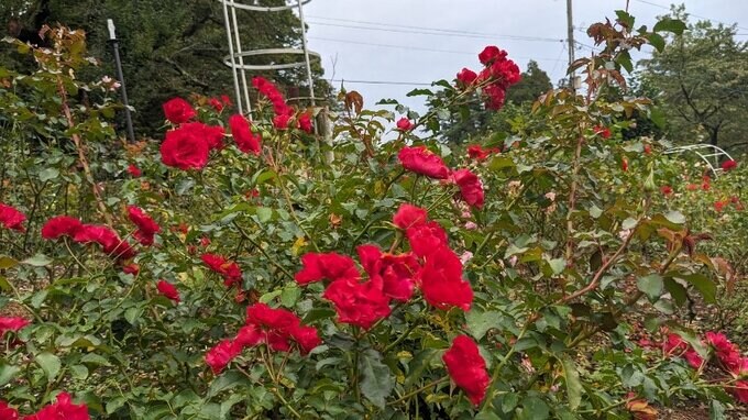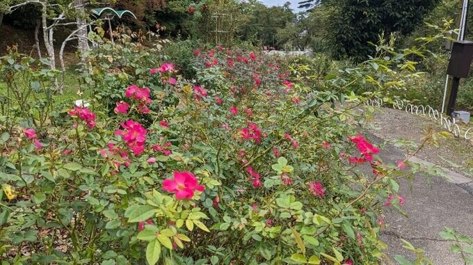 今年は9月に雨が多く、朝に気温が上がらない日が多かったため、まだ咲いていない花も多いということですが、それでも園内には赤や白、ピンク、黄色など色とりどりのバラが咲き誇っています。