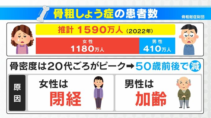 骨粗鬆症財団によりますと、推計では全国に1590万人いるとされ、性別では女性が圧倒的に多く全体の75%を占めています。