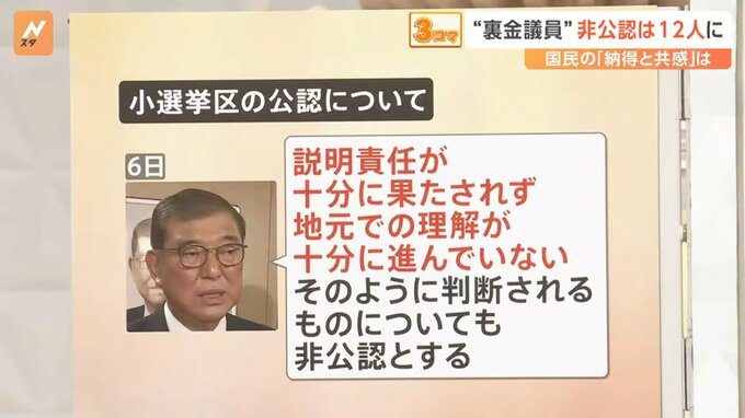 石破総理は6日、小選挙区の公認について「説明責任が十分に果たされず地元での理解が十分に進んでいない。そのように判断されるものについても非公認とする」としていました。