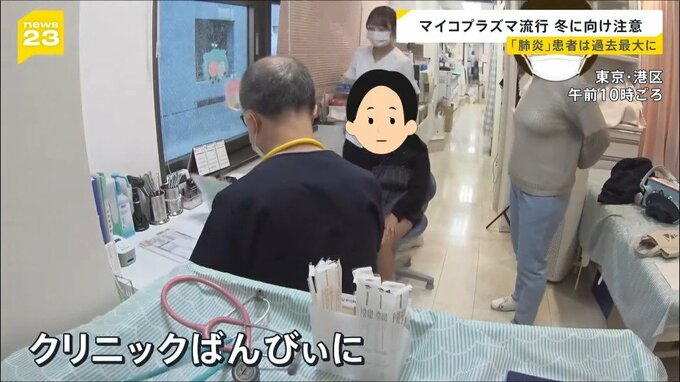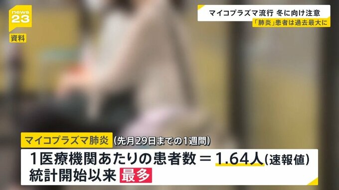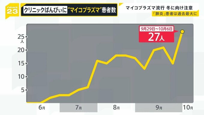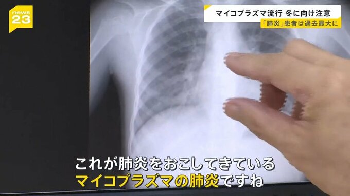 「通常秋から冬にかけて流行すると言われている。(寒くなって)換気がしにくくなり、流行が続くことが考えられる。(陽性者のうち)約10%がマイコプラズマ肺炎と診断される。咳が出ている方はぜひマスクをして、学校生活や通常の生活をしていただきたい」