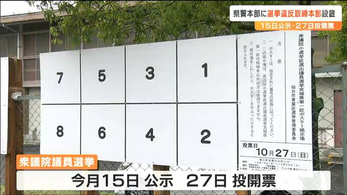 15日公示、27日に投開票の衆議院議員選挙を前に10日、宮城県警に選挙違反取締本部が設置されました。