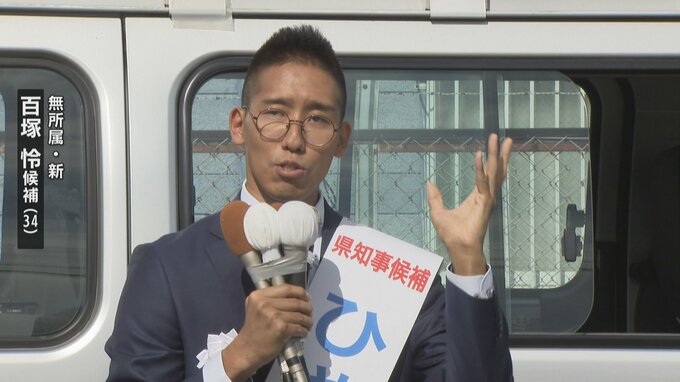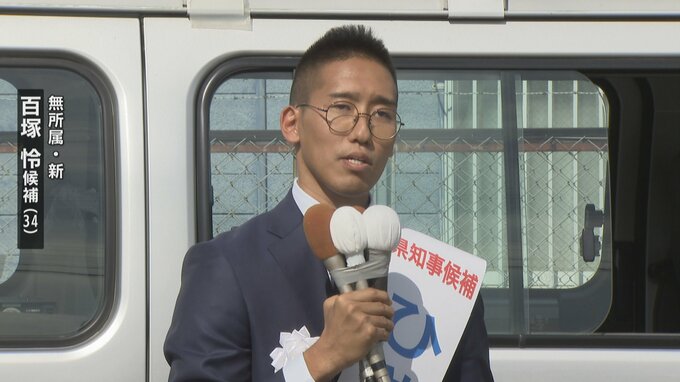 百塚怜候補:「子育て支援の充実、物価高が進んでいるのに給料が上がらない、子育てにかかるお金はどんどん上がる。その負担は計り知れないほどに大変なものだろうと思います。私は声を上げにくい、そういったみなさんのために力を尽くしていきたい、全身全霊で県民の生活を支える覚悟であります」