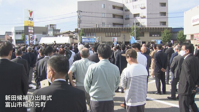 新田知事:「富山県をさらに改革して、さらに前に進め、さらにウェルビーイングの高い、そんな県にしていくことをここにお誓いをいたします。そして、引き続き、15の市町村長さんとワンチームで、富山県を発展をさせていく」「これからもしっかりと頑張ってまいります。そのために2期目を目指すこの戦い、今日から17日間、元気に明るく走り抜いてまいります」