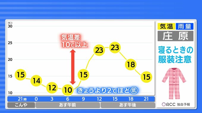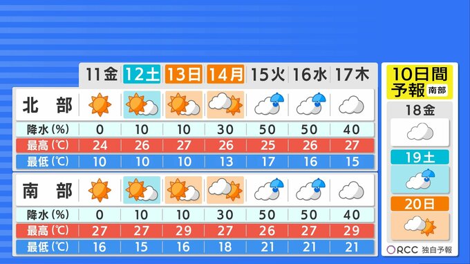 晴れる分放射冷却が効き、きょうよりも朝の気温は下がる地点が多い見込みです。あすも北部では最低気温1ケタの地点もある見込みです。日中はきょうと同じくらいまで気温上がり、カラッとした暑さになります。一日の寒暖差にご注意ください。