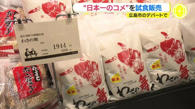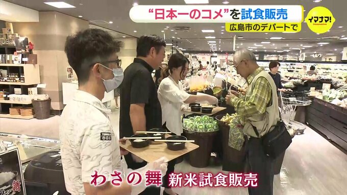 広島市中区の広島三越地下のスーパー「アバンセ」では生産者や北広島町の職員が店頭に立ち「わさの舞」新米の試食販売を行いました。