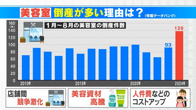 この理由としては、まず店舗間の競争が非常に激しくなっていること、そしてシャンプーなどの美容資材が高騰していることに加えて、人件費なども上がっているということで今、倒産件数が増えているということなんです。