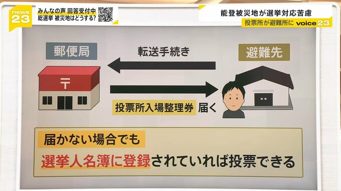 投票所の入場整理券について、郵便局に転送手続きを取っていれば、手元に届きますが、急遽、避難所に入った場合などは入場整理券が届かないことも考えられます。