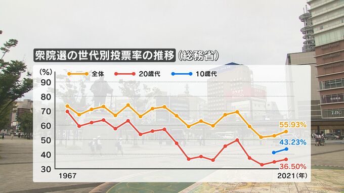 2016年6月の法改正で選挙年齢が18歳以上に引き下げられました。総務省のまとめによりますと、1969年以降に行われた衆院選の世代別の投票率をみると、常に20代が最も低くなっています。次に低いのは、2017年以降に選挙権を得た10代です。