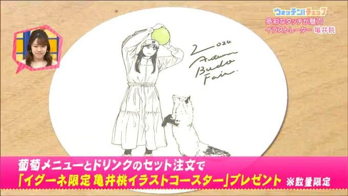 そして、ぶどうフェアの期間中は、期間限定メニューとドリンクをセットで頼むと、亀井さんオリジナルイラストコースターをゲットすることができます。