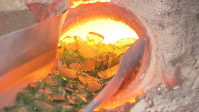 盛吉さんが、作品作りにおいて最もこだわったのが、廃ビンを原料とした、再生ガラスの活用です。