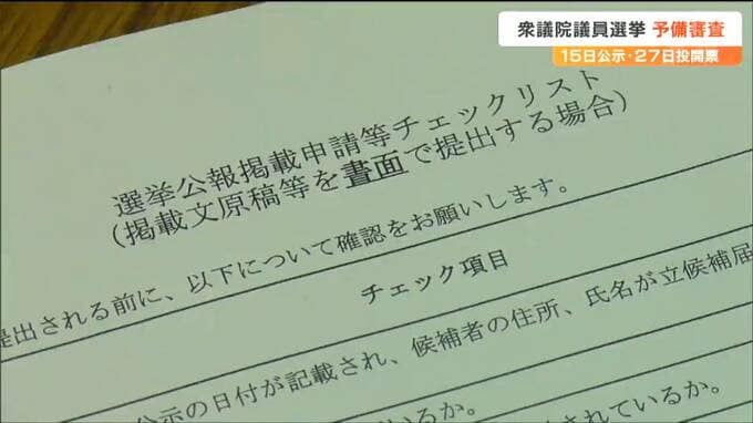 10月15日公示の衆議院議員選挙を前に、立候補に必要な書類を事前に確認する予備審査が、宮城県庁で行われました。衆議院議員選挙の予備審査は、公示日の届け出受け付けを円滑にするため行われるものです。県庁内の…