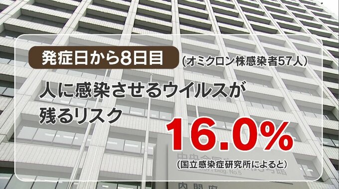 国立感染症研究所がオミクロン株を発症した57人を調べたデータによりますと、発症日から8日目に人に感染させるウイルスが残るリスクは、16.0%となっています。感染症の専門家は、「短縮されても、10日間は自覚をもって行動してほしい」と話します。