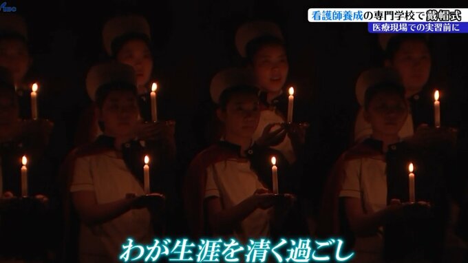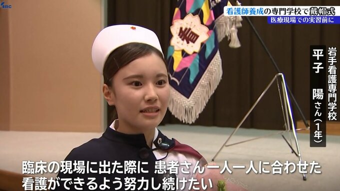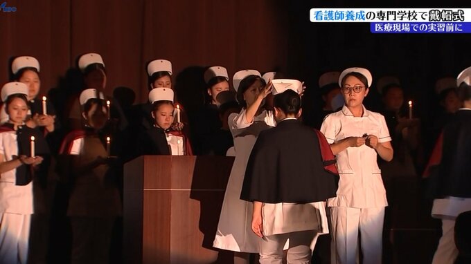 盛岡市にある看護の専門学校で11日、ナースキャップを授ける戴帽式が行われ、生徒たちが医療現場での実習に向けて決意を新たにしていました。