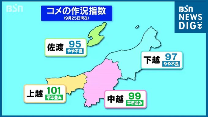北陸農政局は11日、新潟県内の作柄概況を発表しました。それによりますと、9月25日現在の県全体の作況指数は98で、「やや不良」だったということです。地域別でみると、上越が101・中越が99で「平年並み」、下越が9…