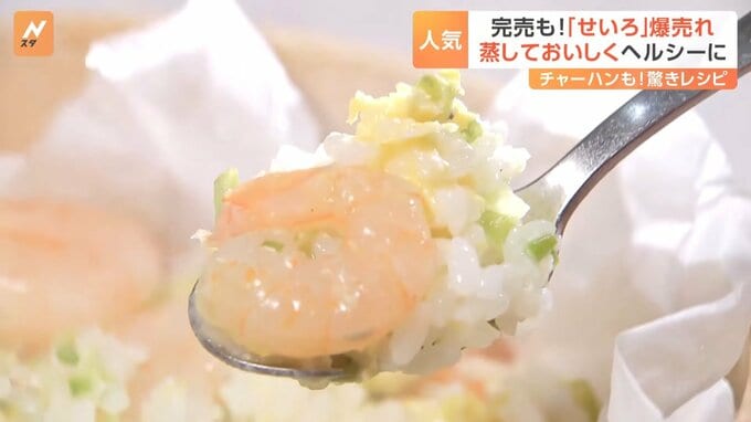「せいろでエビチャーハン。冷蔵のごはんを使うことで、炒めたチャーハンに近いようなパラパラとした食感になります」