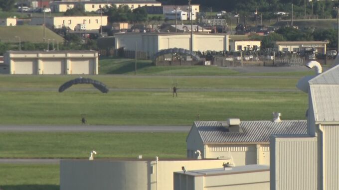 「機体を飛び出した7人の兵士が、今パラシュートを使って次々と嘉手納基地へ降下していきます」