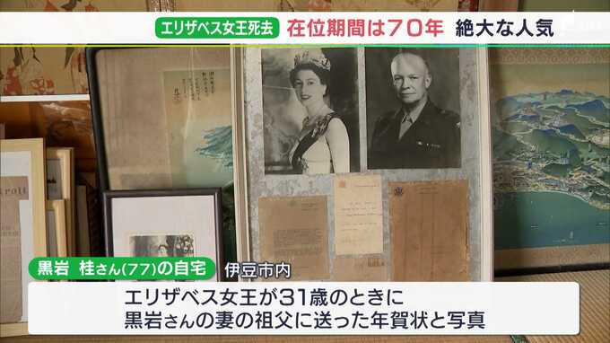 静岡県伊豆市に住む黒岩桂さん77歳の自宅にあるのは、エリザベス女王が31歳のときに黒岩さんの妻の祖父に送った年賀状と写真です。黒岩さんの妻の祖父は、元熱海市長の岸衛さん。岸衛さんは、学校卒業後ヨーロッパなど海外に行き、ホテル経営などを学んでいて、各国を訪れているときにエリザベス女王と知り合ったとみられます。