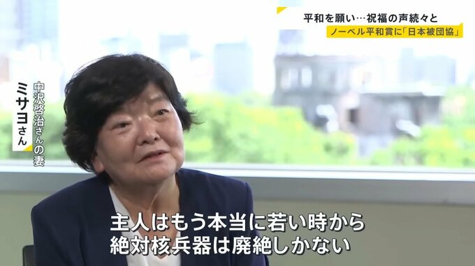 「主人はもう本当に若い時から絶対核兵器は廃絶しかない、こんな恐ろしいもの二度と作っちゃいけないという思いはありましたからね。それをずっと被団協の人は何十年やっていらっしゃるでしょう。世界に訴えてる。もう私からもう嬉しくて」