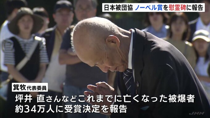 今年のノーベル平和賞に選ばれた日本被団協の箕牧代表委員が広島市の平和公園を訪れ、慰霊碑に受賞決定を報告しました。今年のノーベル平和賞に選ばれた日本被団協=日本原水爆被害者団体協議会の箕牧代表委員はき…