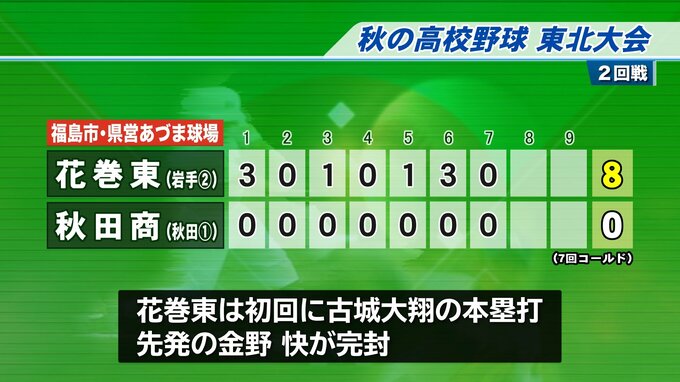 秋田第1代表の秋田商業と対戦した岩手第2代表の花巻東は、初回に4番古城のホームランで3点を奪うと、その後も3回、5回、6回と得点を重ねます。守っては先発の金野が相手の得点を許さず7回コールド8対0で勝ちました。