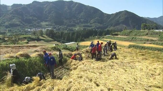 高千穂町では、棚田米の収穫イベントが開かれました。世界農業遺産にも認定されている高千穂町の川登棚田群。収穫イベントには宮崎梅田学園の硬式野球部の選手など約20人が参加し秋晴れの下、黄金色に実ったヒノヒ…