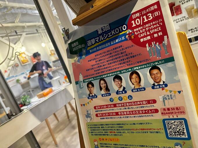 衆院選の公示直前となる10月13日、東京15区から立候補を予定している5人が参加して「選挙マルシェKOTO」が開かれた。「選挙マルシェ」は地域の住民が主体となり、投票率の向上などを目的に開催したパネルディスカッションだ。他者を論破するのではなく、立候補予定者による建設的な議論や人となりが伝わることを目的としている。主催者の意向に賛同したカフェのオーナーが、無償で会場を提供したという。