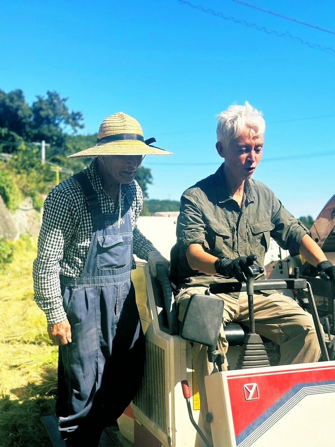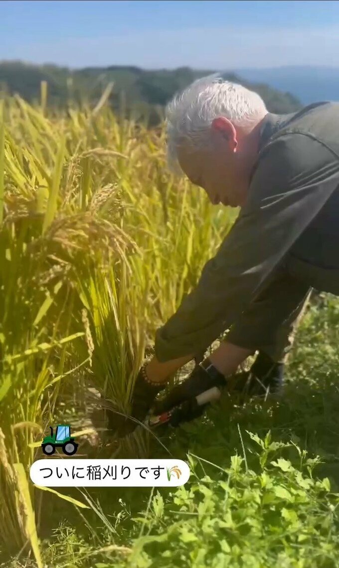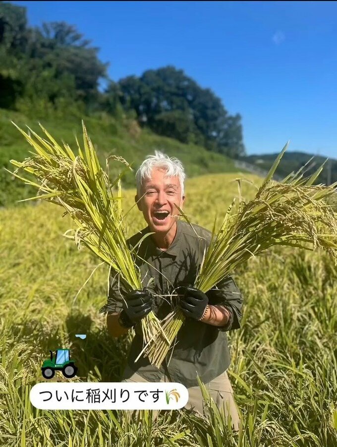 マークさんは、Xで「最高なお米ができました」と、両手に稲を持ち、微笑む写真を投稿。「そして、初めてのコンバイン(笑)」と、農業機械を運転している様子もアップしました。
