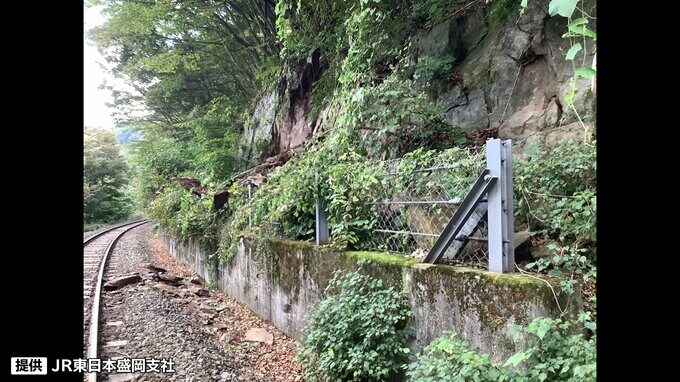 現地を確したところ、線路脇の斜面にある岩盤が高さ約6.5メートル、幅約4メートルにわたって崩れているのが見つかりました。落石の危険性があるとして、JR東日本盛岡支社は遠野駅と釜石駅の間の上下線で運転見合わせの継続を決め、当面の間運休(区間運休含む)すると発表しました。復旧の見通しは立っていないということです。
