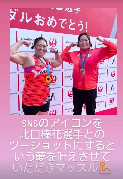 インスタグラムのストーリーズでは「SNSのアイコンを北口榛花選手とのツーショットにするという夢をかなえさせていただきマッスル」と、自身のインスタグラムやXのアイコンを、北口選手とのツーショットに変更したことを報告しました。