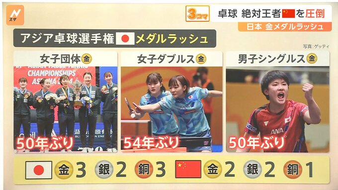 約半世紀ぶりの快挙です。卓球のアジア選手権で、女子団体は金メダルを獲得し、決勝で中国の団体をやぶりました。