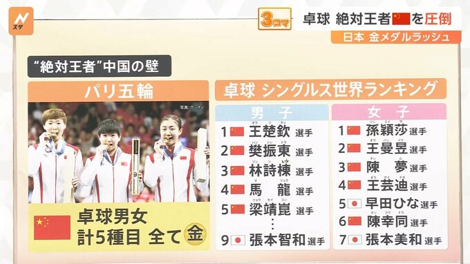 “絶対王者”中国の壁といわれています。中国は、パリオリンピック™において、卓球の男女5種目全てで金メダルを獲得しました。