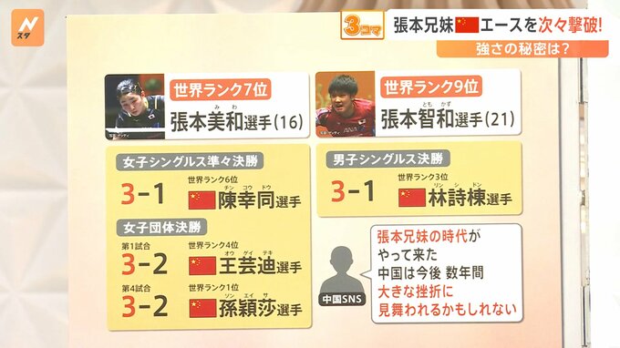 中国のSNSで「張本兄妹の時代がやって来た。中国は今後数年間、大きな挫折に見舞われるかもしれない」と書かれるほど衝撃を与えています。