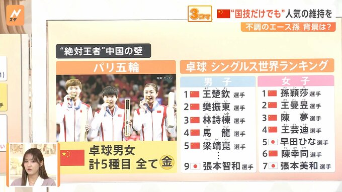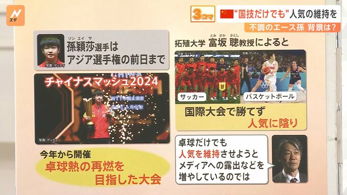 拓殖大学の富坂聡教授によると、サッカーやバスケットボールは、なかなか国際大会で勝てず、国内の人気に陰りがあったということです。富坂教授は「卓球だけでも人気を維持させようと、メディアへの露出などを増やしているのでは」と指摘しました。