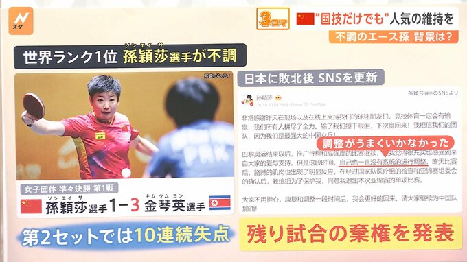 さらに世界ランキング1位の孫穎莎選手が不調だったということです。