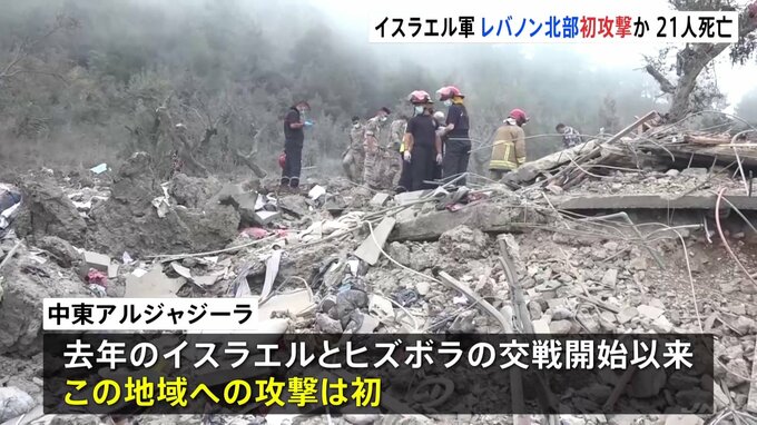 レバノン北部にイスラエル軍の空爆があり、21人が死亡しました。イスラム教シーア派組織ヒズボラの主要拠点から離れているとされるこの地域への攻撃は初めてだということです。激しく破壊された車。14日、レバノン…