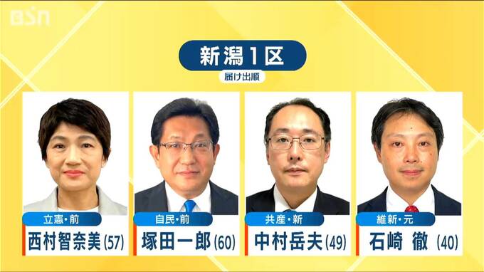 15日に公示された『第50回衆議院議員総選挙』で新潟1区に立候補を届け出たのは届け出順に、