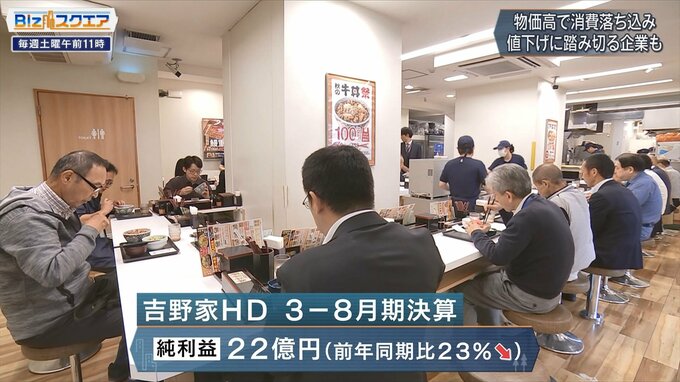 吉野家ホールディングスの2024年3月から8月の決算は、純利益が前年同時期と比べて23%減少。人件費の上昇が利益を圧迫した。厳しい環境の中での値下げの狙いは、物価高が続いている中での、新規の来客や既存客の再来店だという。
