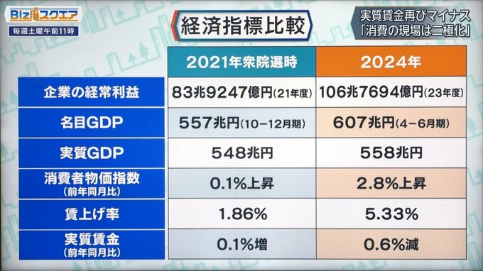 「企業の経常利益」は20兆円余り増え、過去最高の106兆円になった。「名目GDP」も初めて600兆円を超えた。一方で「実質GDP」はほぼ横ばい。「物価」と「賃金」は上がっているが、効果が相殺されて「実質賃金」はマイナスになっている。