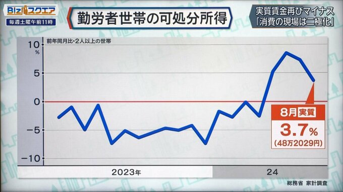 2人以上の世帯のうち勤労者世帯の可処分所得は48万2029円で、前年同月比3.7%増加、4か月連続のプラスとなっている。これは「実質」の数字で、「家計調査」は年金世帯など収入がない、働いてない世帯も入っている。勤労者世帯だけを取ると、実は2024年の半ばぐらいから可処分所得は定額減税もあってプラスに転じており、引き続き8月もプラスだ。手元にお金がある世帯も出てきているはずだが、そんな簡単に「節約モード」からは変わらない。