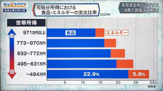 食品支出はそんなに削ることはできないので、所得が少ない人はその比率が高くなる。いま国内で米の値段などすごく高い。そうすると、食品支出がどうしても大きくなってしまう。そうすると低所得者の物価上昇感や生活苦は、より色濃く出ることが統計からもはっきりわかってくる。