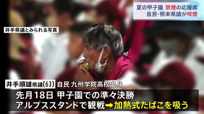 元熊本県議会議長・自民党の井手順雄県議会議員が8月、夏の甲子園の応援中、禁煙の球場の応援席で喫煙していたことがわかりました。井手順雄県議は、九州学院高校出身で、井手県議によりますと、8月18日に阪神甲子…