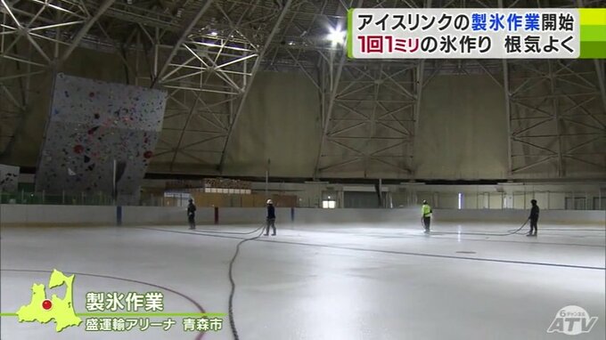 青森市の盛運輸アリーナでは、14日から24時間体制で「ホッケーリンク」と「スピードリンク」の製氷作業が行われています。