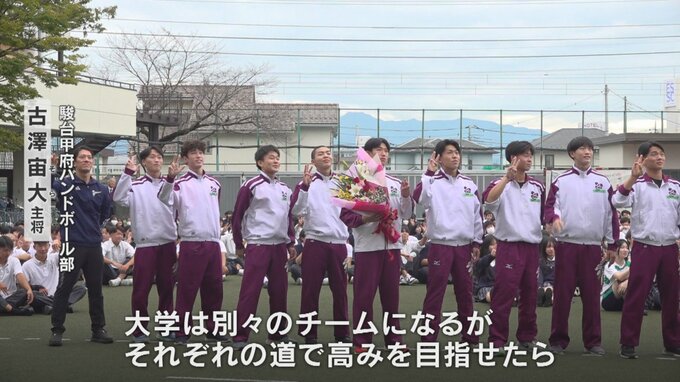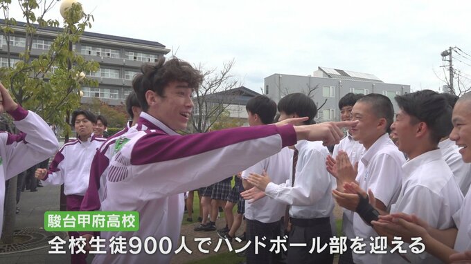 15日午後1時すぎ学校に到着した駿台甲府ハンドボール部は全校生徒約900人の歓声で迎えられました。
